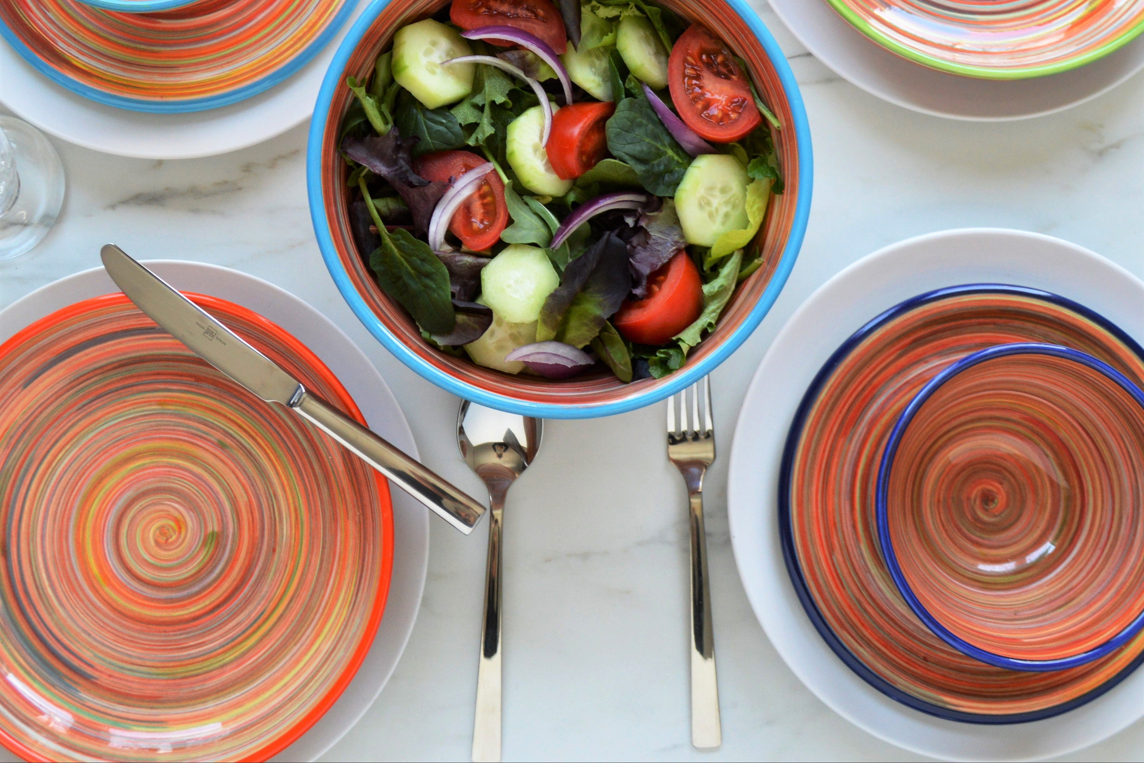 Experience the joy of painting with the Raia Collection by Euro Ceramica. Completely hand-painted by Spanish artisans, every stripe and swirl of the Raia design is unique to the character of that piece. With no two plates exactly alike, the charm of the colorful rainbow of oranges or blues will shine on any table.